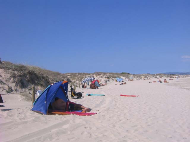 Ohne Schatten wäre es selbst noch im Spätherbst zu heiss an der Sonne. Das kleine Zelt ist im Hui aufgestellt und auch ein super Windschutz (vor allem beim Lesen der überdimensioniert grossen BILD-Zeitung, eine andere gibts kaum).