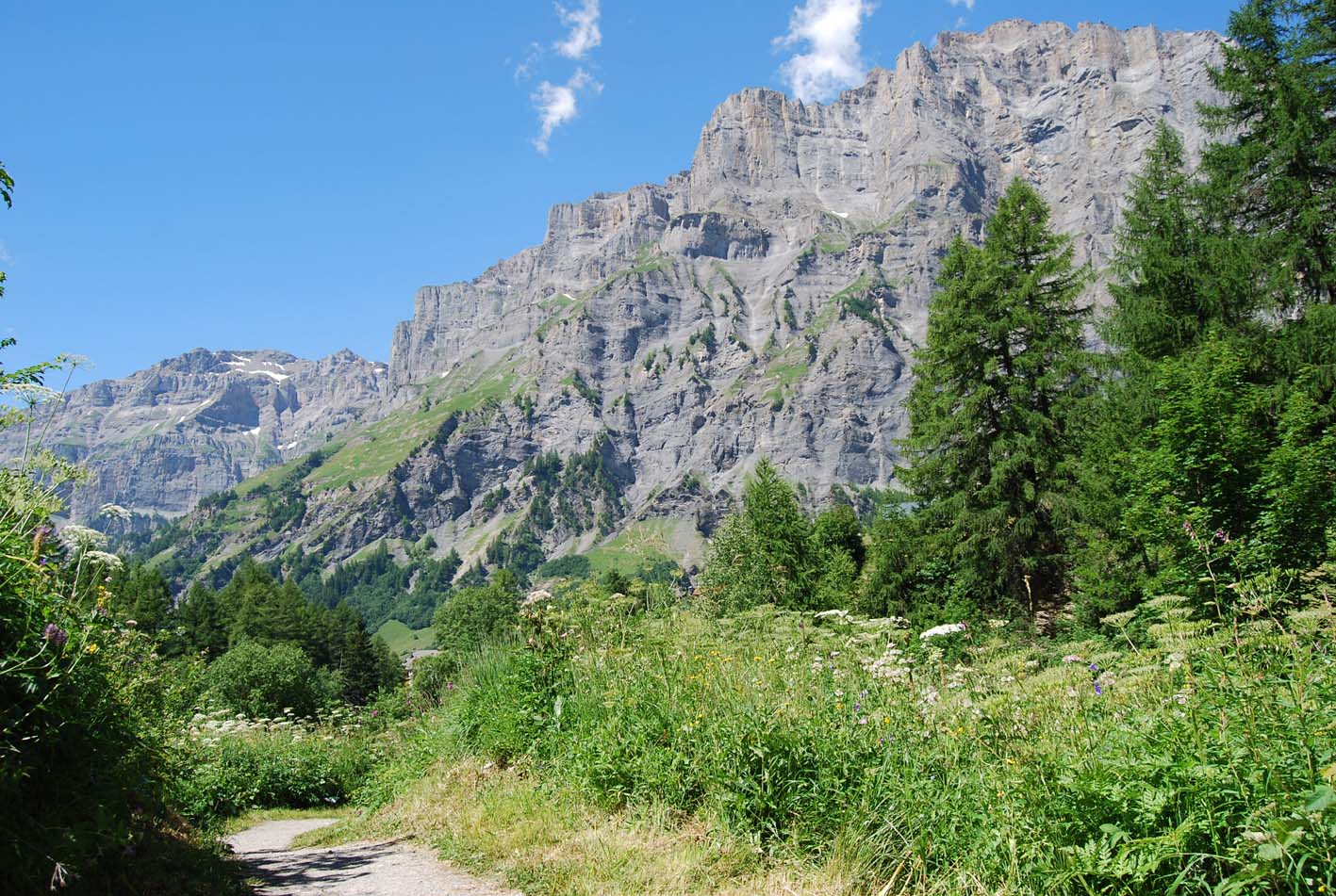 Spaziergang zum Thermalquellen-Steg, hinter dem Dorf, zum Fluss Dala (seit 2004 können die Besucher/innen in die Schlucht wandern). Etwas rechts der Felswand, auf dem Bild nicht ersichtlich, schwebt die Gemmibahn steil zum Gemmipass rauf. | ||
