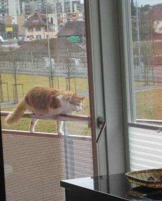 9.6.2009 Freue mich wie ein Kind auf die Tierchen. Obschon sie erst in zwei Monaten kommen, liess ich bereits vom Schreiner eine ganze Fenstertüre ausbauen und eine mit Katzentürli einbauen (tüüri Sach), bastelte ein Katzenbett mit Wasserhyazinthengeflecht und Öko-Teddy-Stoff und säge nun ein Loch in die Balkonverkleidung, damit ein Übergang auf die Passerelle gelegt werden kann... Binn narrisch woarden :-p